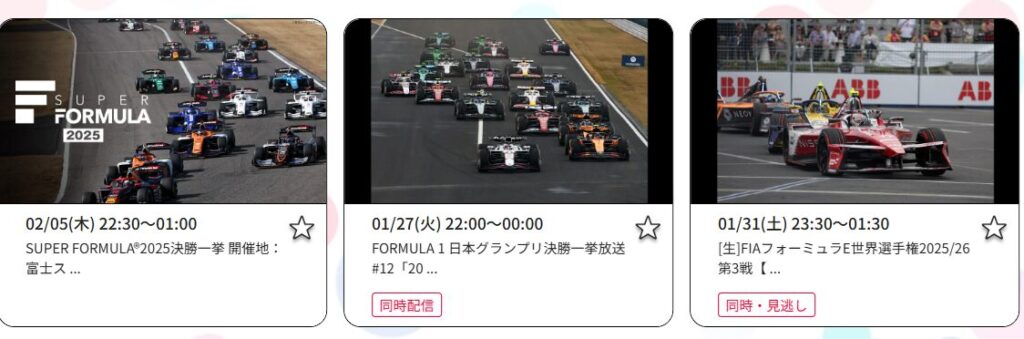 見逃し配信やハイライト映像が用意されているため、時差のある開催地のレースも無理なく楽しめます。