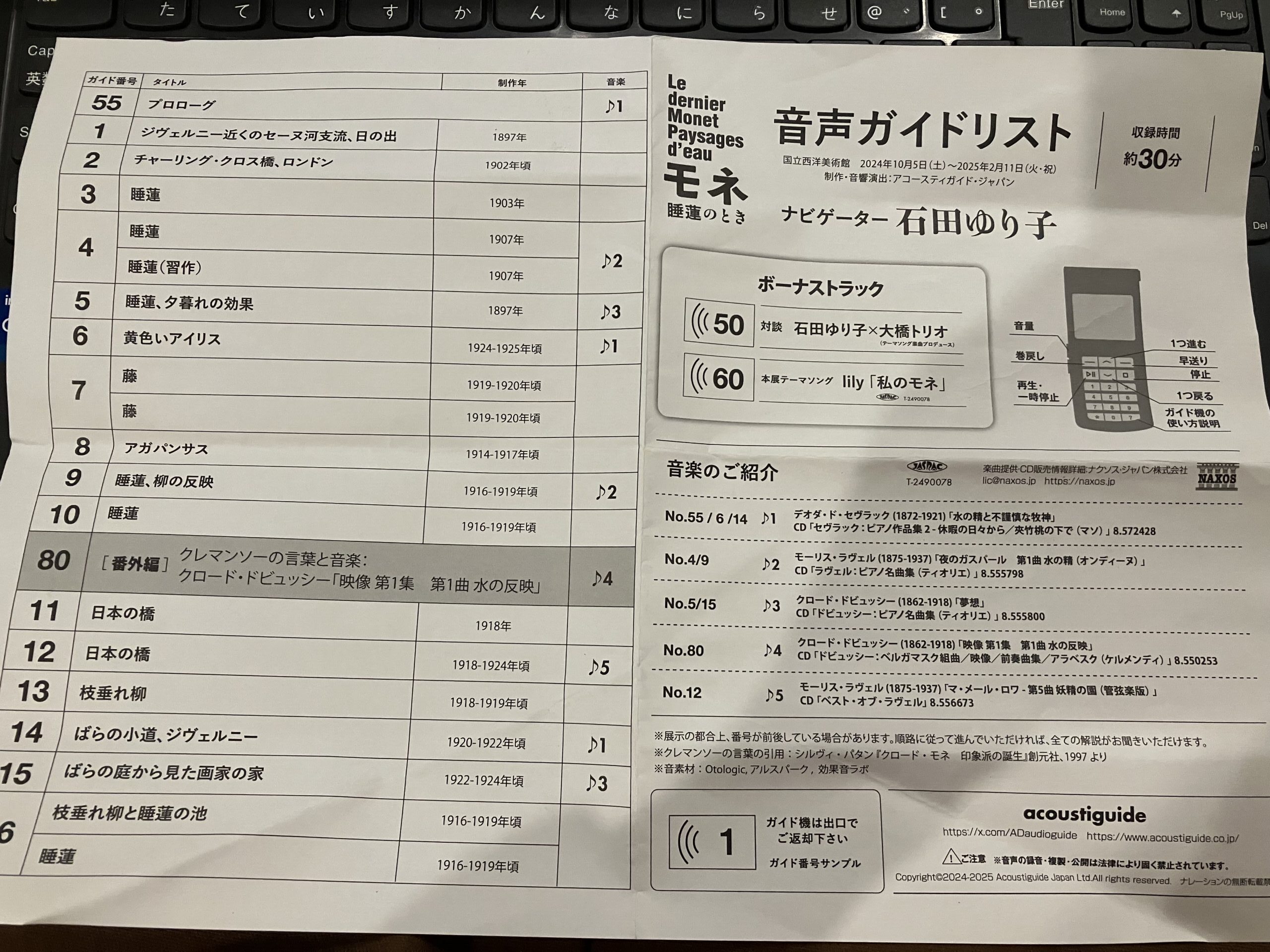 石田ゆり子さんのオーディオ解説も借りて鑑賞しながら聴き入りました。BGMとして流れた曲のリストも貰って、家に帰っても、そのBGMで楽しめました。さっき掃除をしていたら出てきたので、ちょっとクシャクシャですが…ごめんなさいね。