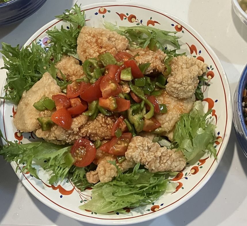 すでに揚げてある鶏肉をレンジでチンして軽くフライパンで焦げ目をつけるだけ。あとはソースにピーマンとトマトのみじん切りを入れてまぜるだけ。