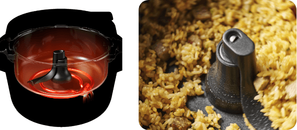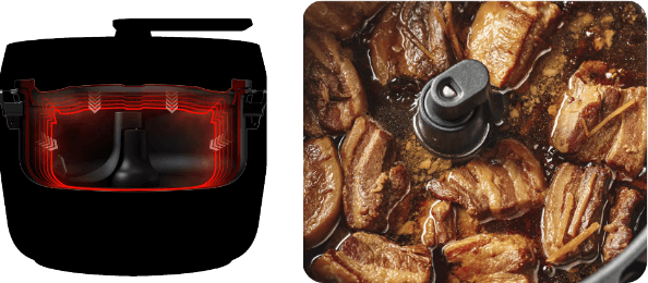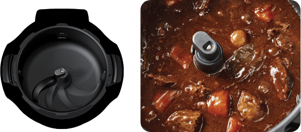 すじの多いお肉はほろほろに、魚も高圧で骨まで丸ごと食べられる柔らかさに。メニューに応じて高圧、中圧、低圧の3段階を使い分け。加圧と鍋底かき混ぜを同時に実現。