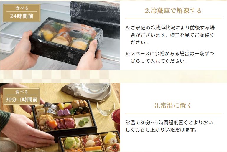 お重には一品一品おいしく盛り付けを済ませ、作りたてのおいしさを保つために急速冷凍してお届けします。届いたら冷凍庫へ。
