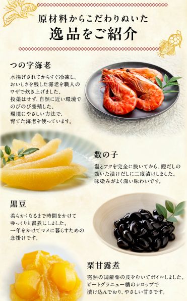 伝統的な技法で丁寧に作られた縁起物は、上品な味付けで素材の旨味が際立っており、日本の美しい正月文化を伝えてくれます。