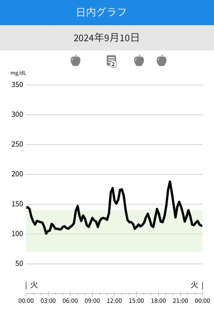 一日の血糖値をグラフで表してくれます。これはカンジダ除菌前の私のグラフで、ギザギザなグラフです。悪い例ですね。緩やかなグラフが理想的で夜間のギザギザを減らすのが目的です。