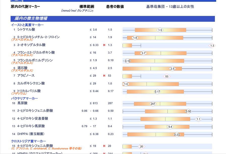 アラビノースがあなたの数値は53と、基準値を大きく超過しています。やはり腸にカンジダいますね。カンジダ除菌をしましょう。