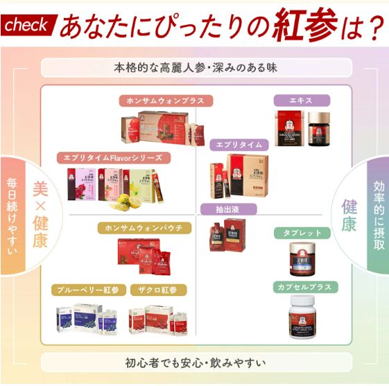 | 紅参エキス量(1包10ml) | 3g、ジンセノサイド11.6mgの高濃度 | 1g、オリゴ糖添加で調整 |